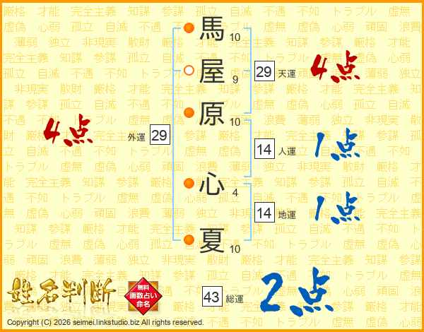 馬屋原心夏さんの総運は43画の2点!