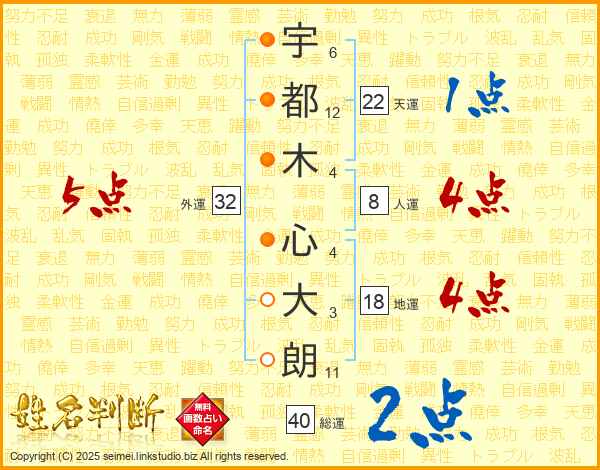 宇(6画)都(12画)木(4画) 心(4画)大(3画)朗(11画)