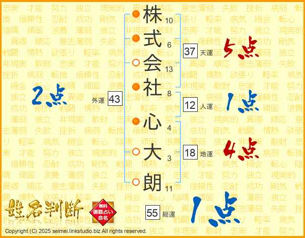 株(10画)式(6画)会(13画)社(8画) 心(4画)大(3画)朗(11画)