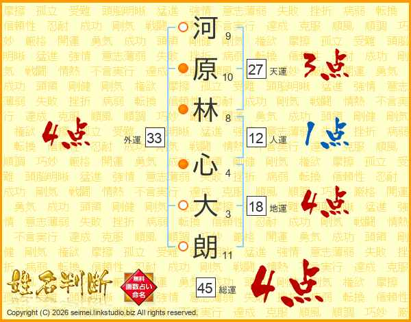 河(9画)原(10画)林(8画) 心(4画)大(3画)朗(11画)