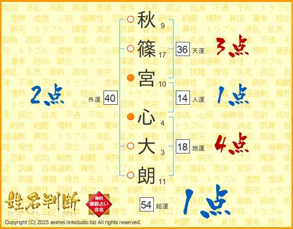 秋(9画)篠(17画)宮(10画) 心(4画)大(3画)朗(11画)