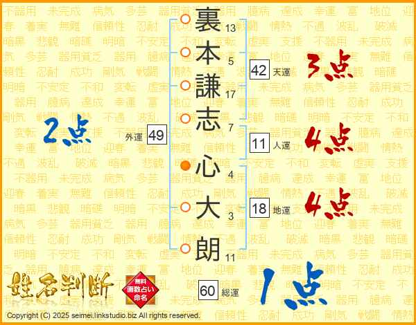 裏(13画)本(5画)謙(17画)志(7画) 心(4画)大(3画)朗(11画)