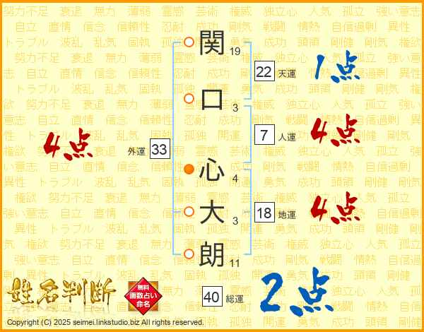 関(19画)口(3画) 心(4画)大(3画)朗(11画)