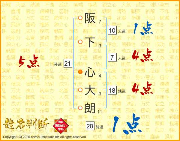 阪(7画)下(3画) 心(4画)大(3画)朗(11画)