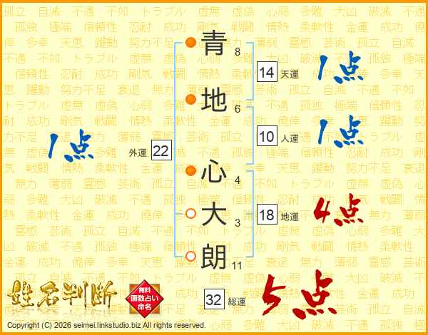 青(8画)地(6画) 心(4画)大(3画)朗(11画)