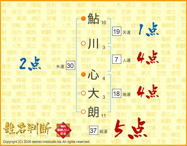 鮎(16画)川(3画) 心(4画)大(3画)朗(11画)