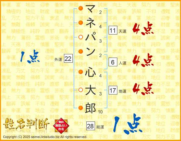 マ(2画)ネ(4画)パ(3画)ン(2画) 心(4画)大(3画)郎(10画)