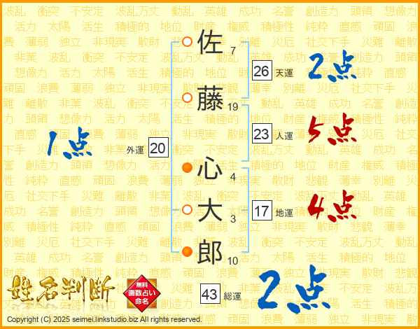 佐(7画)藤(19画) 心(4画)大(3画)郎(10画)