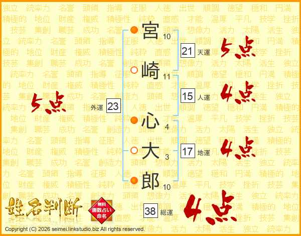 宮(10画)崎(11画) 心(4画)大(3画)郎(10画)