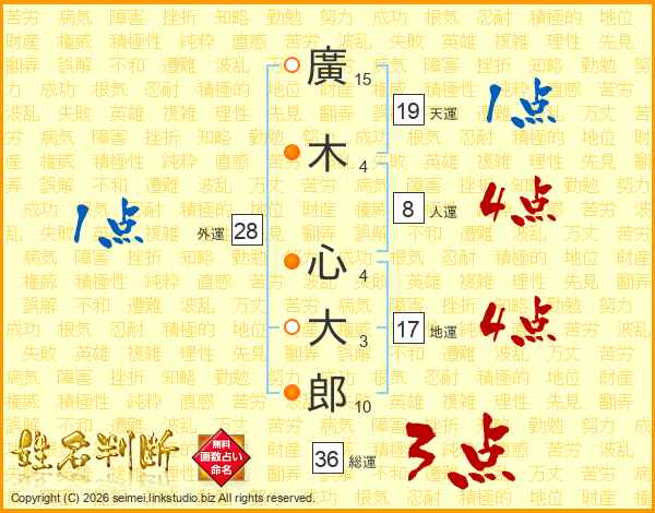 廣(15画)木(4画) 心(4画)大(3画)郎(10画)