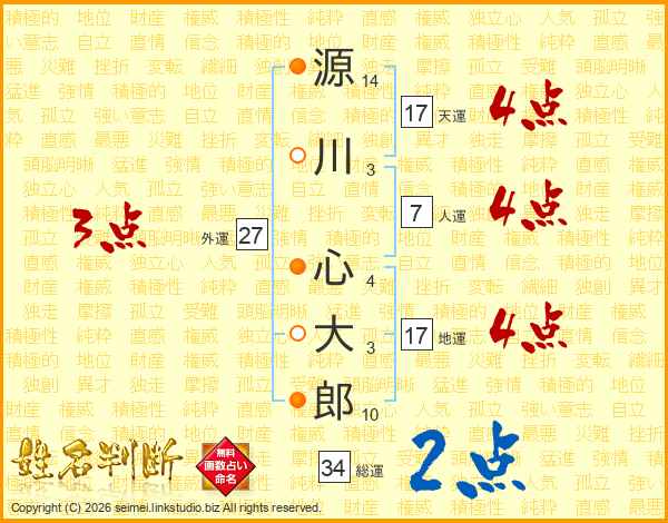 源(14画)川(3画) 心(4画)大(3画)郎(10画)