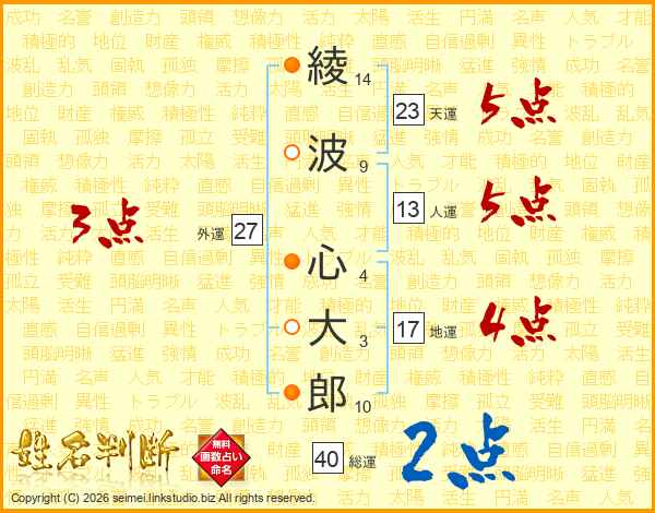 綾(14画)波(9画) 心(4画)大(3画)郎(10画)