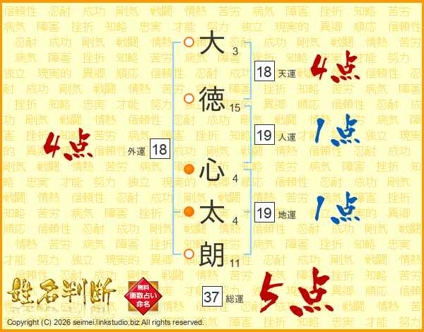 大(3画)徳(15画) 心(4画)太(4画)朗(11画)