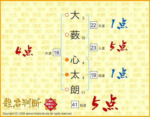 大(3画)薮(19画) 心(4画)太(4画)朗(11画)