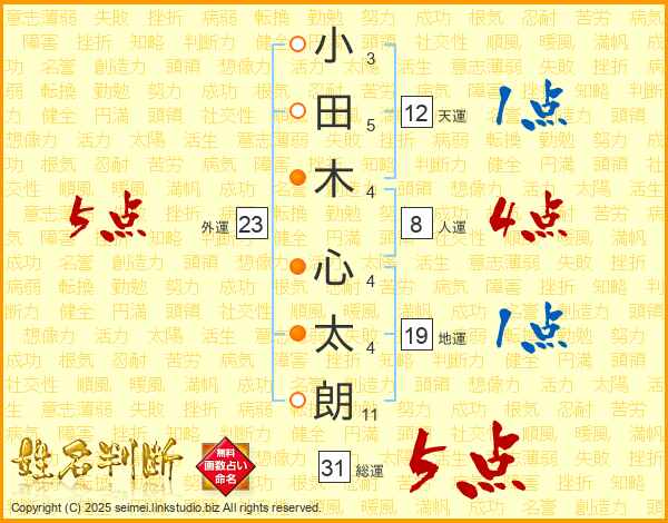 小(3画)田(5画)木(4画) 心(4画)太(4画)朗(11画)
