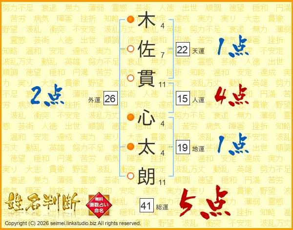 木(4画)佐(7画)貫(11画) 心(4画)太(4画)朗(11画)
