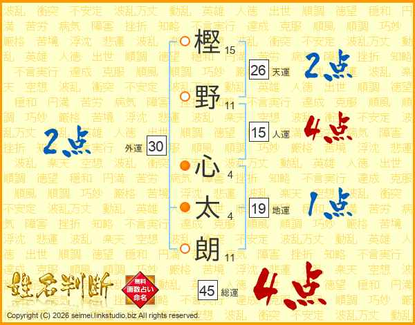 樫(15画)野(11画) 心(4画)太(4画)朗(11画)