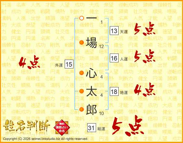 一(1画)場(12画) 心(4画)太(4画)郎(10画)