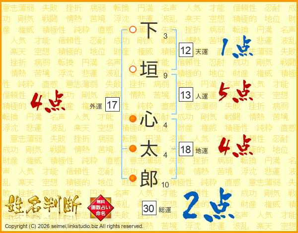 下(3画)垣(9画) 心(4画)太(4画)郎(10画)