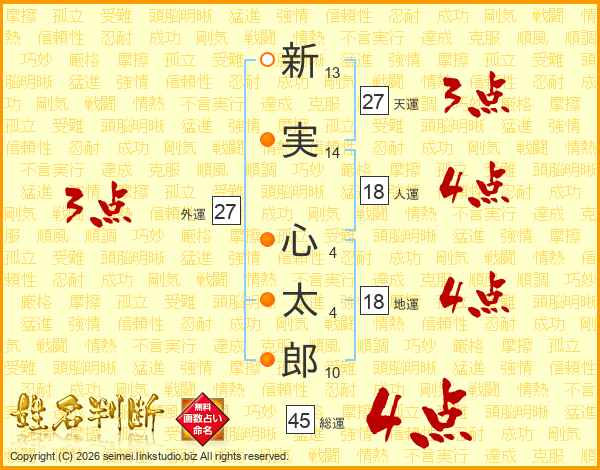 新(13画)実(14画) 心(4画)太(4画)郎(10画)