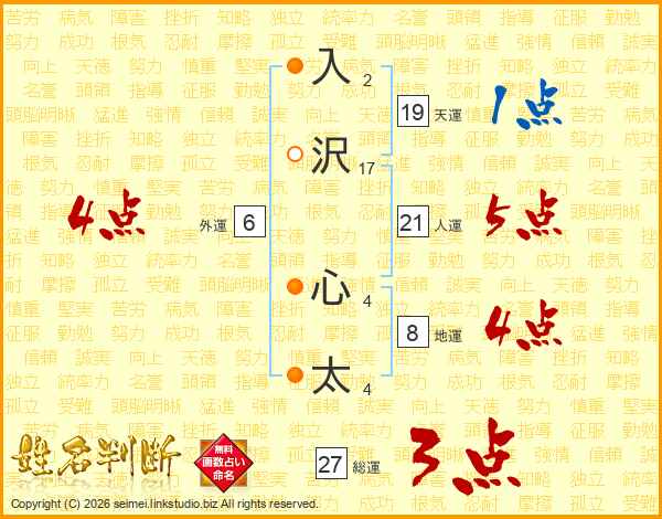 生活面を象徴する運勢です。外部から受ける影響力を表し、結婚運、家庭運や職場、環境への順応性を表します。総運から人運を引いた画数。姓や名が1文字の場合を除く。