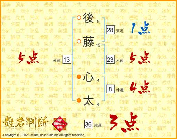 後(9画)藤(19画) 心(4画)太(4画)