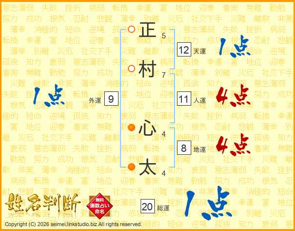 正(5画)村(7画) 心(4画)太(4画)