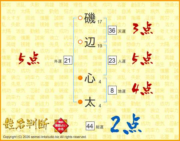 生活面を象徴する運勢です。外部から受ける影響力を表し、結婚運、家庭運や職場、環境への順応性を表します。総運から人運を引いた画数。姓や名が1文字の場合を除く。
