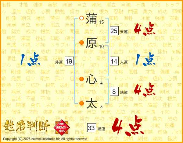 生活面を象徴する運勢です。外部から受ける影響力を表し、結婚運、家庭運や職場、環境への順応性を表します。総運から人運を引いた画数。姓や名が1文字の場合を除く。