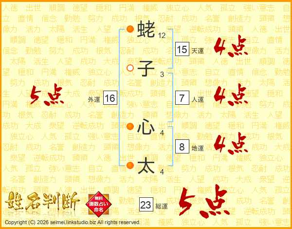 生活面を象徴する運勢です。外部から受ける影響力を表し、結婚運、家庭運や職場、環境への順応性を表します。総運から人運を引いた画数。姓や名が1文字の場合を除く。