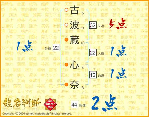 古(5画)波(9画)蔵(18画) 心(4画)奈(8画)
