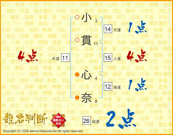 小(3画)貫(11画) 心(4画)奈(8画)