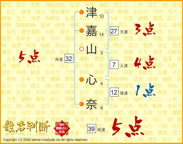 津(10画)嘉(14画)山(3画) 心(4画)奈(8画)