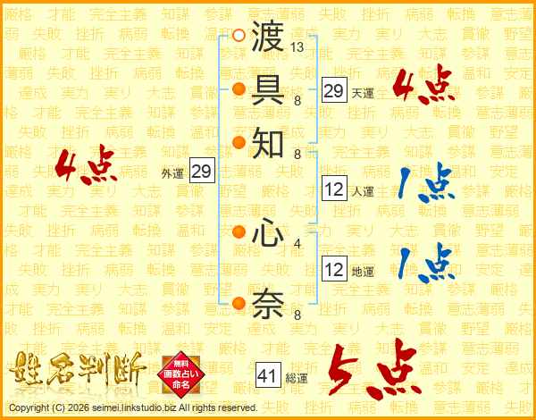 渡(13画)具(8画)知(8画) 心(4画)奈(8画)