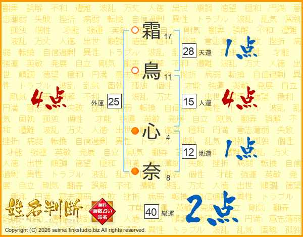 霜(17画)鳥(11画) 心(4画)奈(8画)