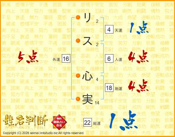 生活面を象徴する運勢です。外部から受ける影響力を表し、結婚運、家庭運や職場、環境への順応性を表します。総運から人運を引いた画数。姓や名が1文字の場合を除く。