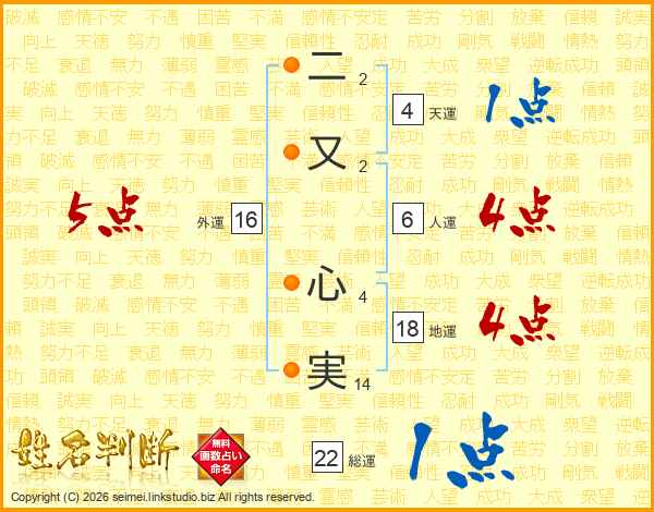 生活面を象徴する運勢です。外部から受ける影響力を表し、結婚運、家庭運や職場、環境への順応性を表します。総運から人運を引いた画数。姓や名が1文字の場合を除く。