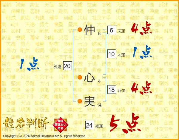 仲(6画) 心(4画)実(14画)