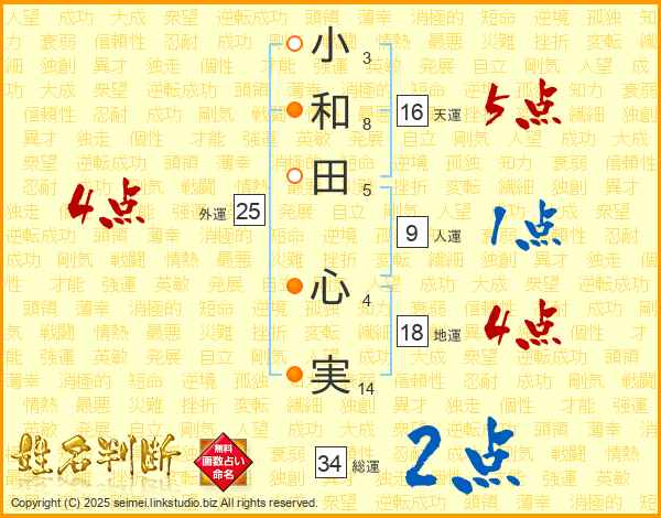 小(3画)和(8画)田(5画) 心(4画)実(14画)