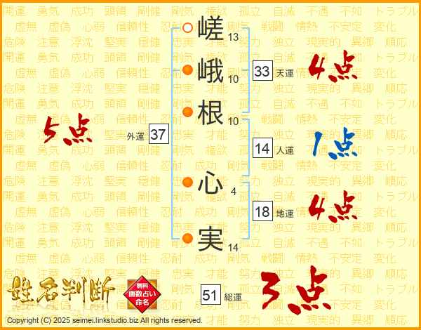 嵯(13画)峨(10画)根(10画) 心(4画)実(14画)