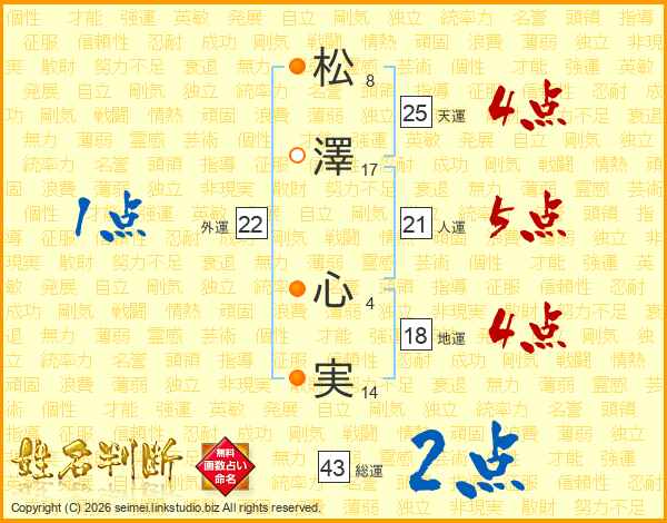 松(8画)澤(17画) 心(4画)実(14画)
