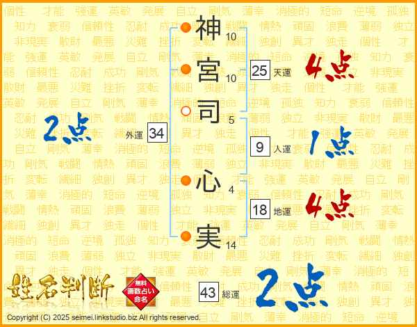 神(10画)宮(10画)司(5画) 心(4画)実(14画)