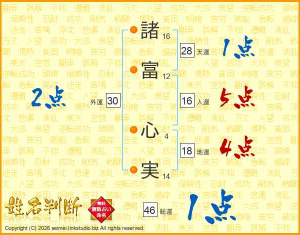 諸(16画)富(12画) 心(4画)実(14画)