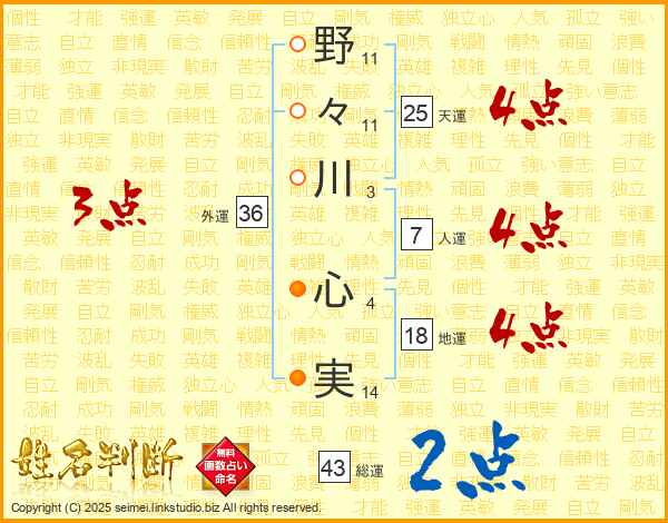 生活面を象徴する運勢です。外部から受ける影響力を表し、結婚運、家庭運や職場、環境への順応性を表します。総運から人運を引いた画数。姓や名が1文字の場合を除く。