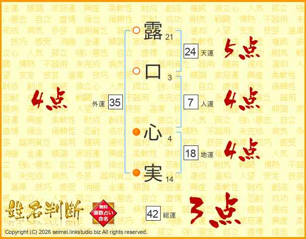 露(21画)口(3画) 心(4画)実(14画)