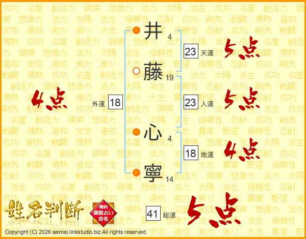 あなたの人生を表す1番重要な運勢です。生涯を通じて影響する総合運となり、主に50歳以降の晩年期に影響を及ぼします。苗字と名前の合計画数。