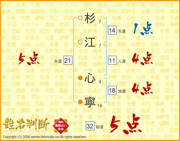 杉(7画)江(7画) 心(4画)寧(14画)