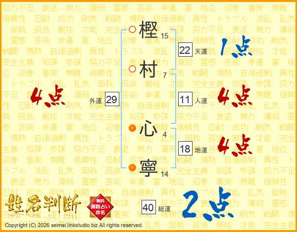 樫(15画)村(7画) 心(4画)寧(14画)