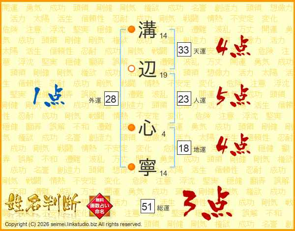 生活面を象徴する運勢です。外部から受ける影響力を表し、結婚運、家庭運や職場、環境への順応性を表します。総運から人運を引いた画数。姓や名が1文字の場合を除く。