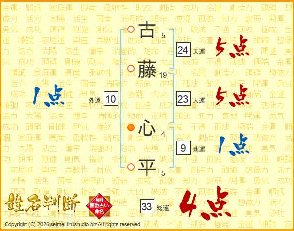 生活面を象徴する運勢です。外部から受ける影響力を表し、結婚運、家庭運や職場、環境への順応性を表します。総運から人運を引いた画数。姓や名が1文字の場合を除く。